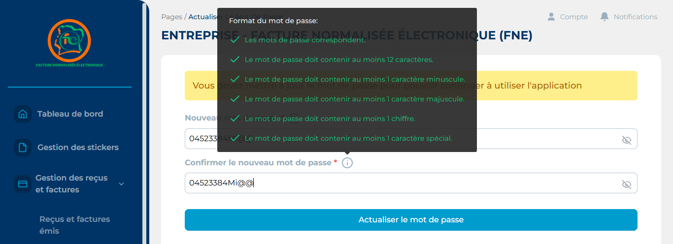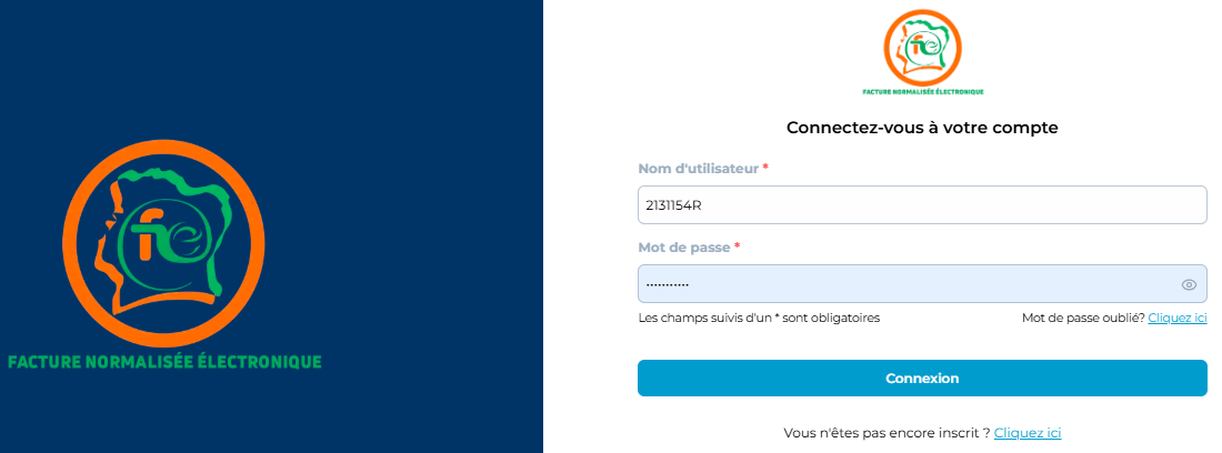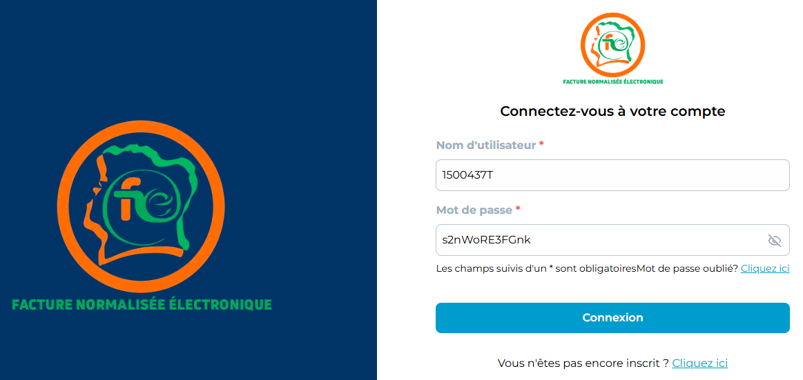 Etape 1 : Connectez-vous à la plateforme FNE avec les identifiants reçus par mail.