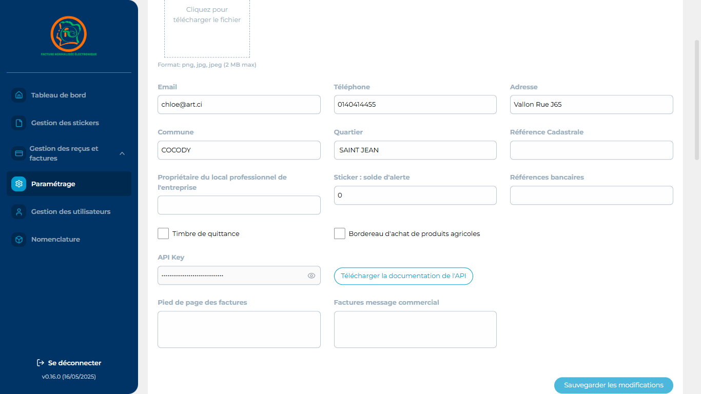 o Importez votre logo (ce logo apparaitra sur toutes vos factures) ;