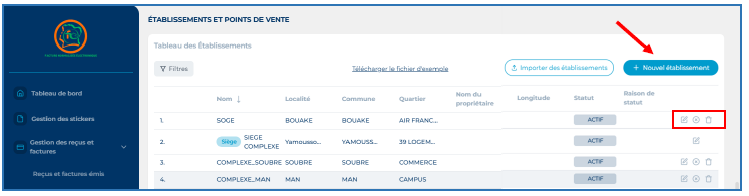 Ajoutez vos établissements secondaires en cliquant sur « + Nouvel établissement ».