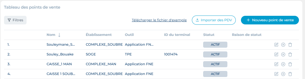 Le point de vente représente une caisse de votre établissement. Si vous disposez de ‘’N caisse’’, il vous faut créer ‘’N point de vente’’. Chaque point de vente est relié à un établissement.