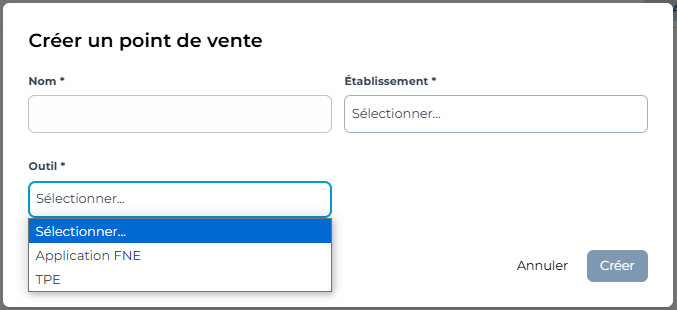 Au cours de la création, vous devrez définir le nom de la caisse, sélectionner l’établissement et le type d’outil de facturation utilisé à cette caisse.